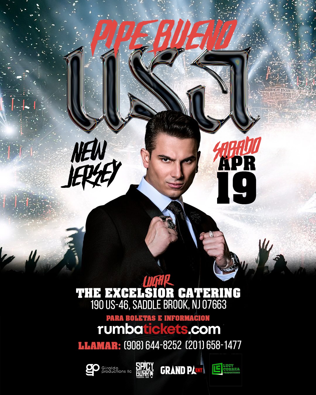 New Jersey, nos vemos este Sabado 19 Abril en The Excelsior Catering, 190 US - 46, Saddle Brook, NJ, 07663, con PIPE BUENO, en concierto cantando todos sus exitos, ven y disfruta con tus amigos una noche inolvidable.