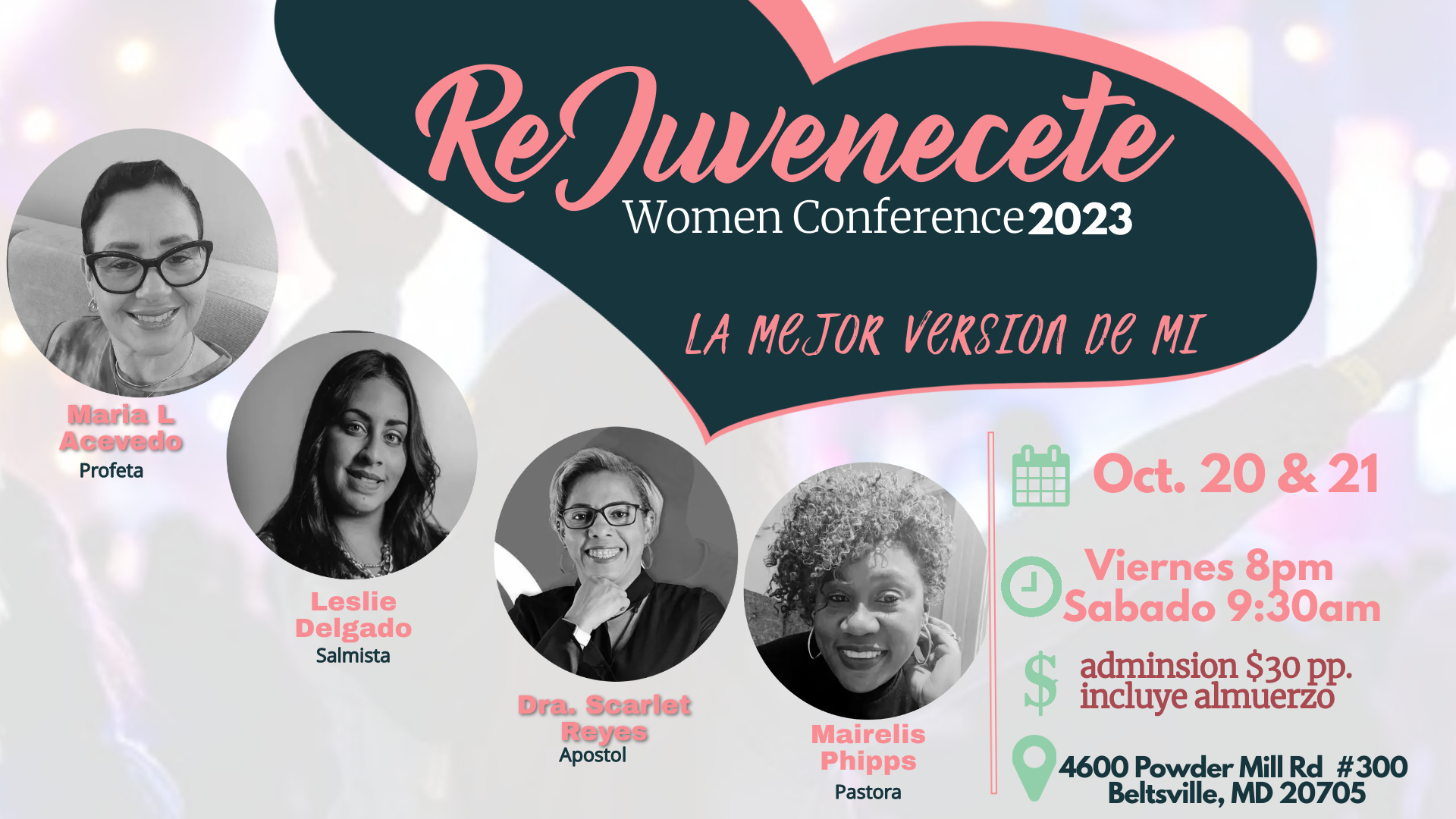 Únete a nosotros para un fin de semana transformador de rejuvenecimiento espiritual y conexión fraternal en el evento REJUVENECETE "La Mejor Version De Mi". Este es una invitación para mujeres de todas las etapas de la vida a congregarse, dejar a un lado las demandas de sus ajetreadas rutinas y sumergirse en la presencia de Dios.